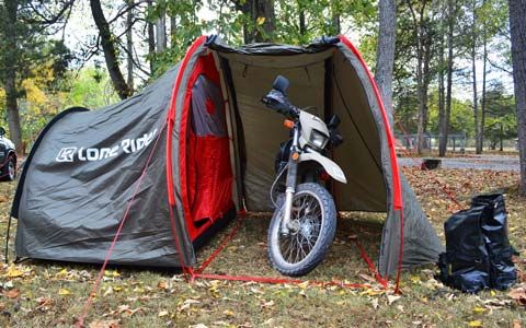 The garage will easily accommodate a full-size adventure bike with panniers, so my DR650 fit in with room to spare for extra gear. If you leave your bike outside, the garage/vestibule has plenty of room for two or three adults to sit in camp chairs out of the elements in the event of bad weather. Additionally, there are hooks in the top of the tent to hang your gear to dry at the end of a day riding in the rain. A fold-up ground cover for the garage area would be a nice addition but I carry a small 4′ x 6′ tarp that covers the garage nicely, making a clean dry floor to stand on. If you’re looking for a base camp to live out of for your next big riding trip, the MOTOTENT is a solid addition to your camping inventory. MSRP: $599.99 LoneRider-Motorcycle.com